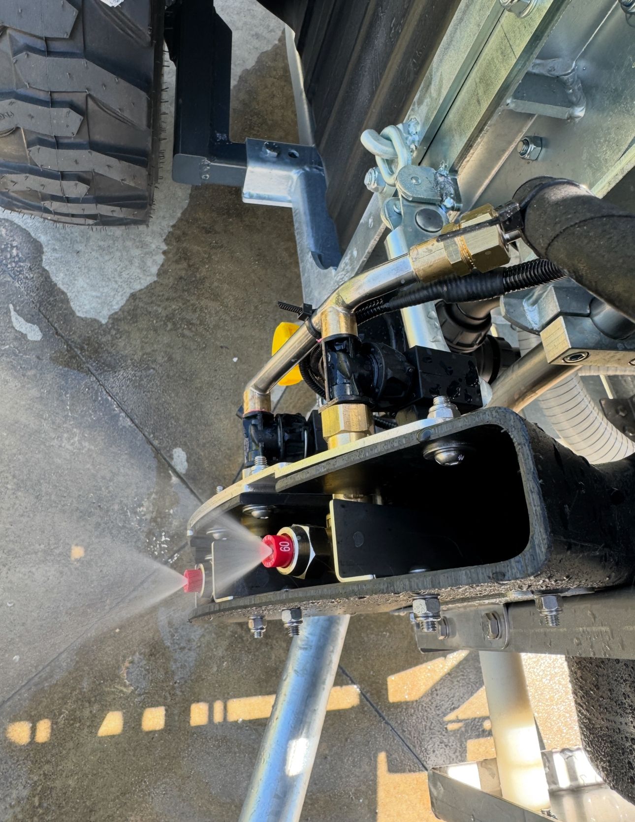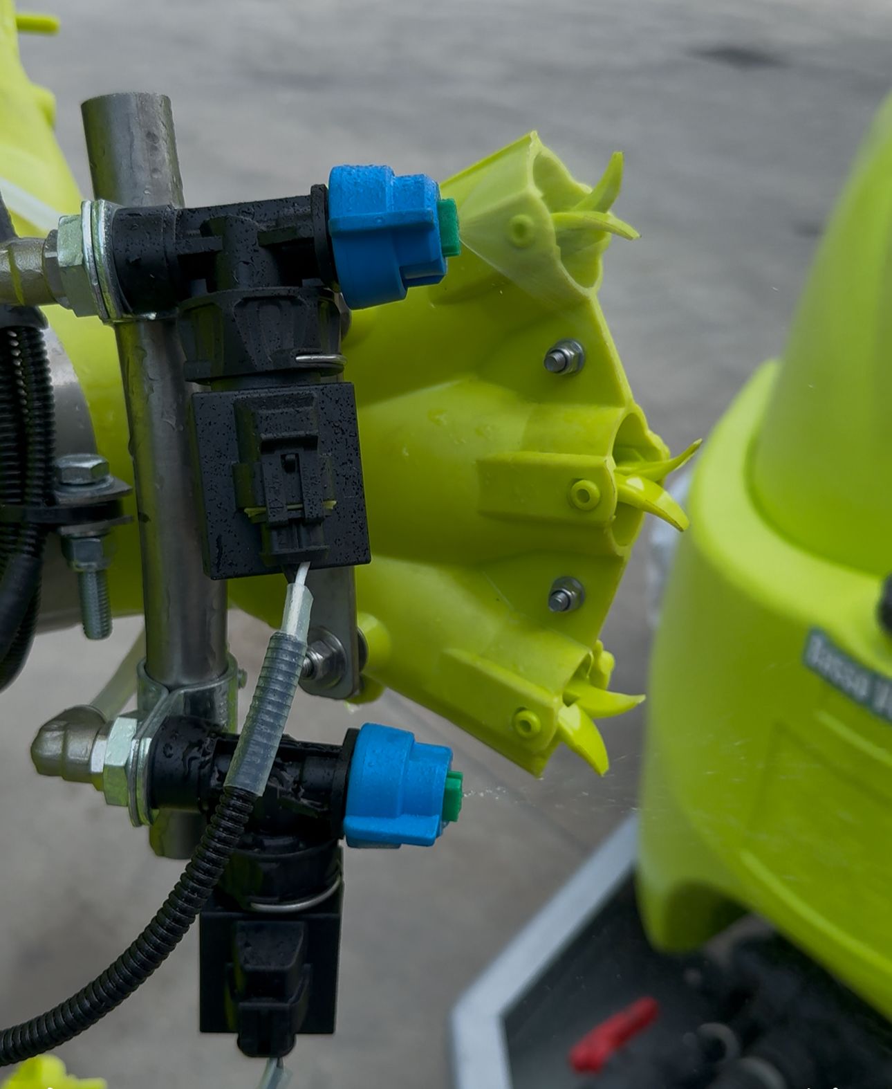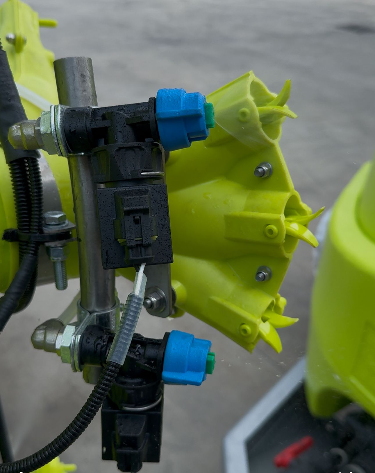 Es besteht aus einem Dual-Technologie-Sensor, der an der Vorderseite des Traktors installiert wird, einer Steuerelektronik sowie einer Reihe von Magnetventilen, die die einzelnen Düsen öffnen.